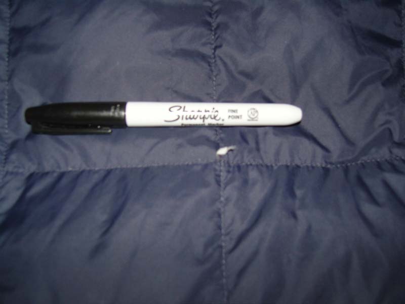 One problem unique to down coats is the continual escape of little feathers. Snowy white down poking through a navy blue nylon shell is very noticeable. At first I just pulled the feathers the rest of the way out and discarded them. But I soon realized that action would deplete the filling. So now I leave feathers poking out wherever they want to (since I can’t shove them back in). But I render them virtually invisible by coloring them with a black Sharpie marker.