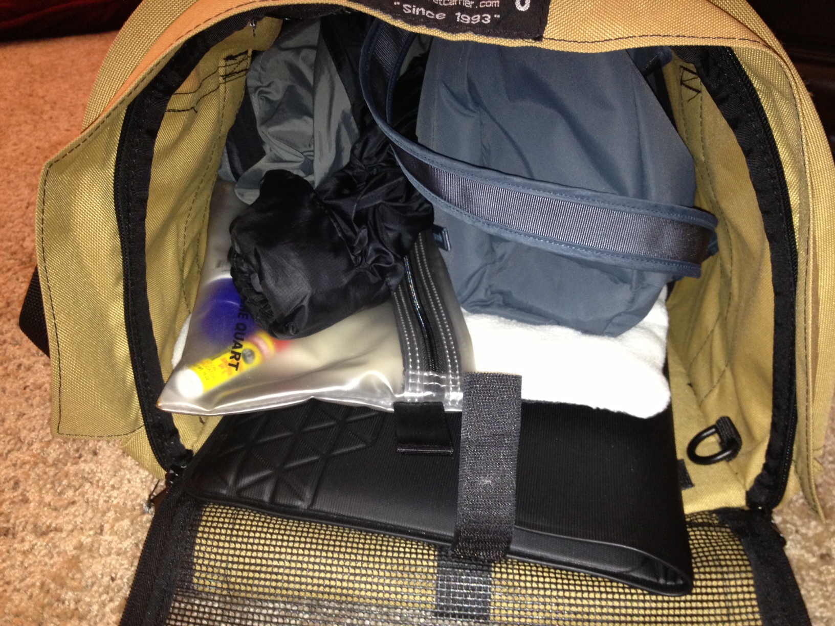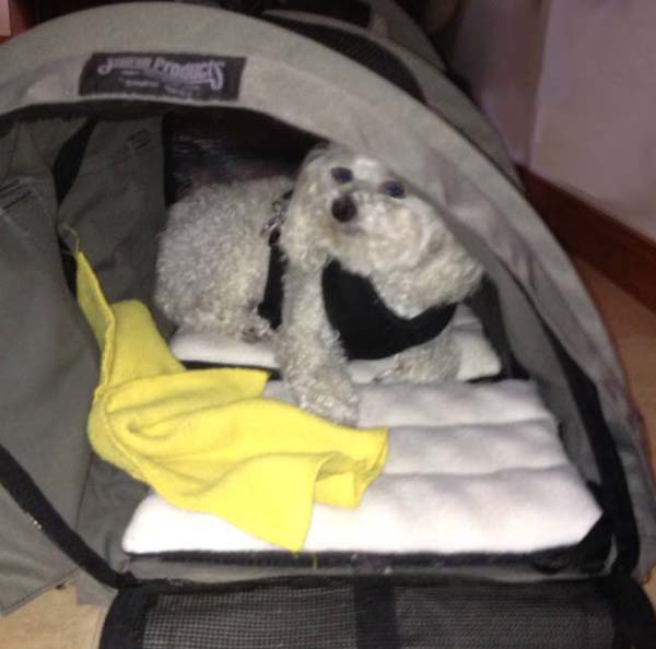 Joyce uses two divided pet carriers she purchased from Sturdi Products. Looney’s is an Extra Large Sturdi Bag, and Tuffy’s is a Large. Each dog rides in his own carrier on the trip to the airport and during ground travel after the flight. Joyce’s laptop fits nicely under the cushion in Tuffy’s bag. The dividers are zippered, so the bags can be transformed into single carriers, giving each dog more room when riding alone.
