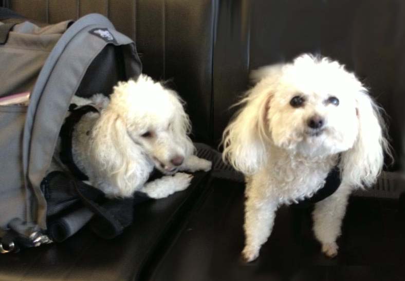 My cousin Joyce is a dedicated “doggy mom” to two adorable poodles, Tuffy and Looney. As a great mother—and daughter—to humans too, she often travels by air to visit family. Naturally the dogs come along.