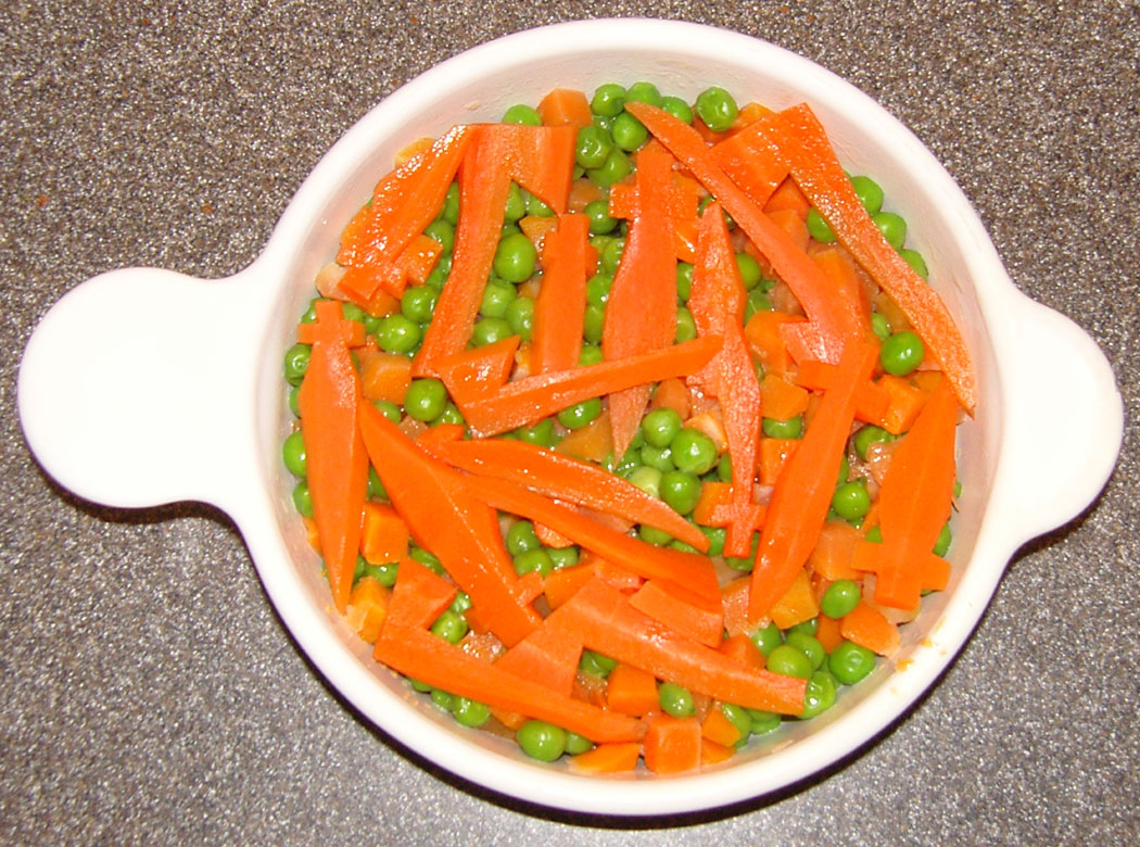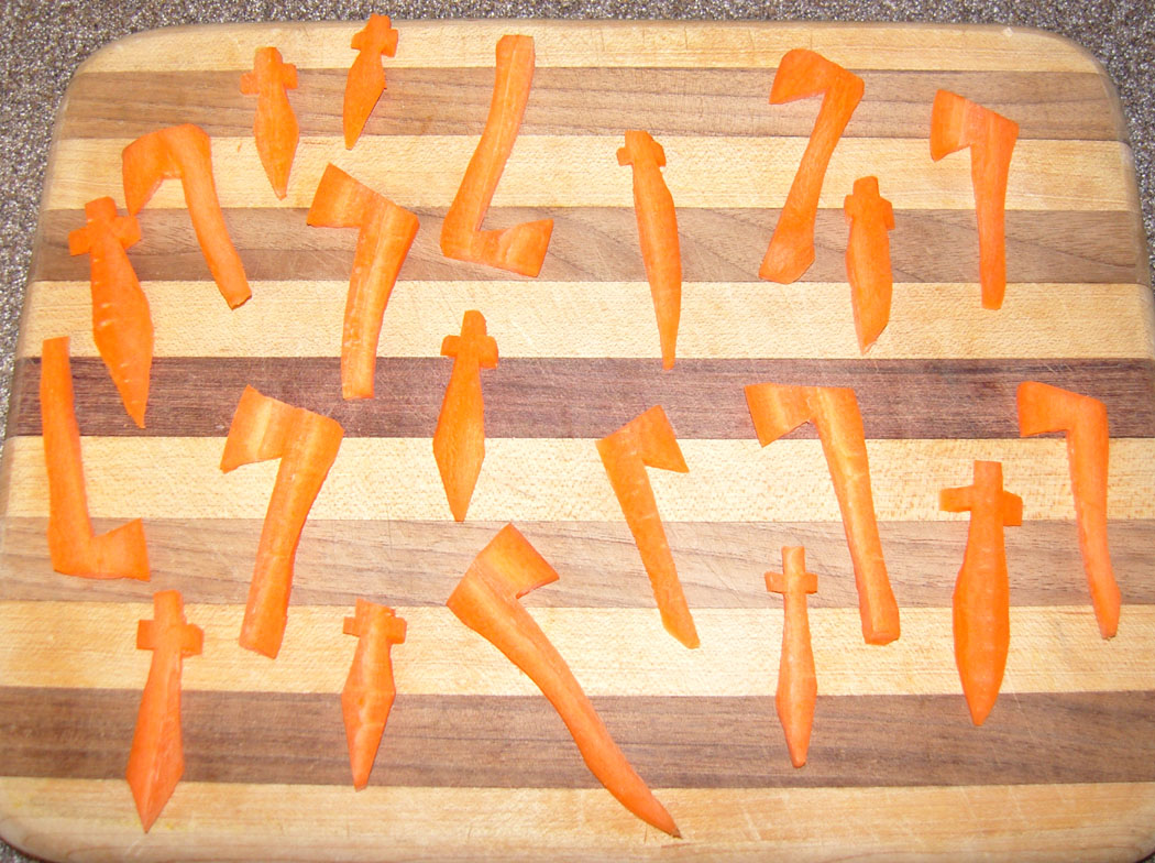 Start with a package of “experience orbs” and “acacia wood blocks” (frozen peas and carrots). Top with flaming axes and swords (carved carrots). The photos below explain how to make the latter.