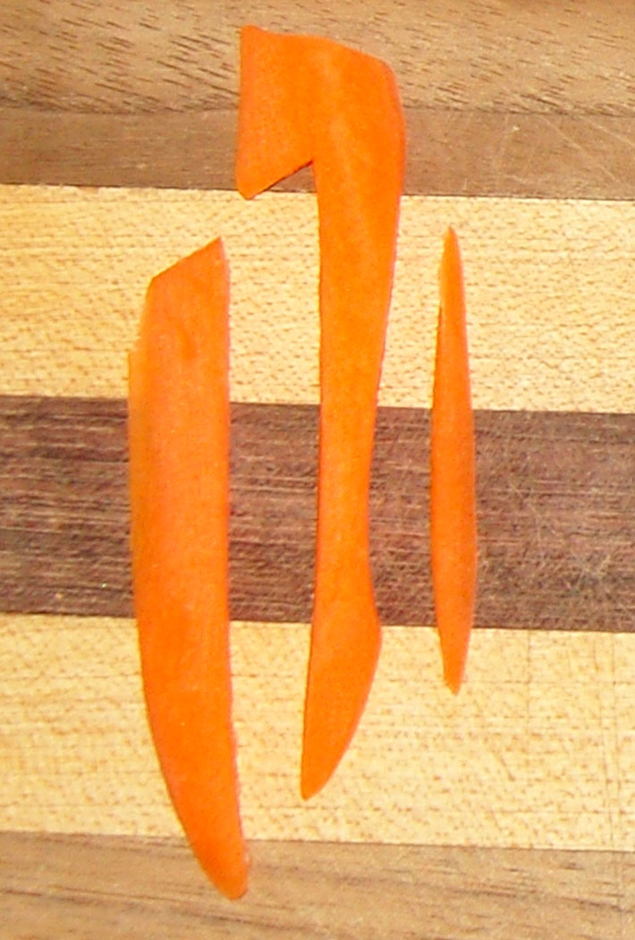 1. Peel fresh carrots. Then, using a sharp paring knife, cut each carrot into thin slabs. Make each carrot slab about 1/16th inch thick.